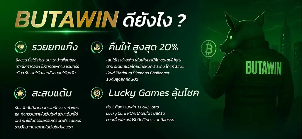 Butawin คือแพลตฟอร์มสล็อต–คาสิโนที่ยืนพื้นบนมาตรฐานสากล มุ่งเน้นความโปร่งใส ความเร็ว และความปลอดภัยของผู้เล่นเป็นหลัก ตั้งแต่ขั้นตอนสมัคร ฝาก ถอน ไปจนถึงการเลือกเกมลิขสิทธิ์แท้จากค่ายชั้นนำ ทุกอย่างถูกออกแบบให้ “ลื่นและไว” ผ่านระบบออโต้ที่เชื่อถือได้ ขณะที่ฝั่งการเงินของ Butawin เน้นความมั่นคง จ่ายจริง ตรวจสอบย้อนหลังได้ พร้อมโปรโมชั่นที่อัปเดตสม่ำเสมอเพื่อเพิ่มความคุ้มค่าในการเล่นของคุณ